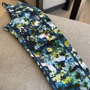 Dynamic floral leggings with blue and green tones. Ideal for workouts.