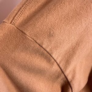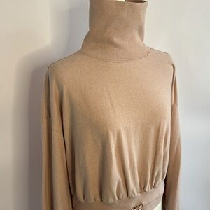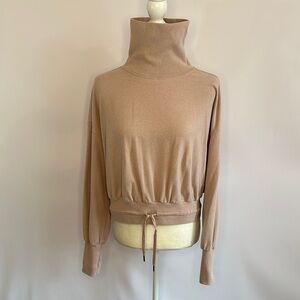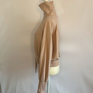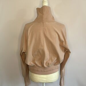 Sweaty Betty funnel neck cropped sweatshirt. Muted blush pink, photos look a little more taupe. Drawstring waist. Pullover style. Cotton/acrylic/elastane blend, feels like velvet/suede. Womens size 8. Faint stain on left shoulder, see photo.