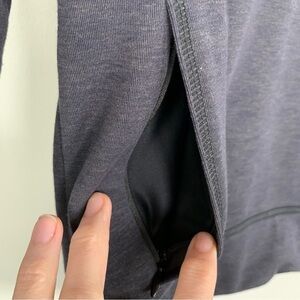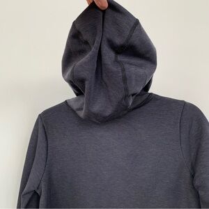 Dark gray/black, a bit oversized, polyester/wool blend, zipper closure kangaroo pocket, longer in back, excellent condition!