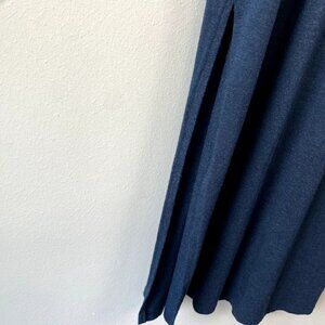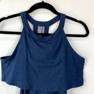 * Features: sleeveless, high neckline, layered bodice with cut outs, racerback, midi length, side slits, solid blue