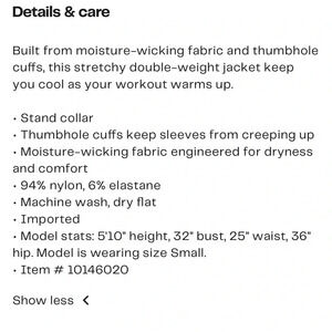 Sweaty Betty Jacket with zip front and thumb holes at sleeves.