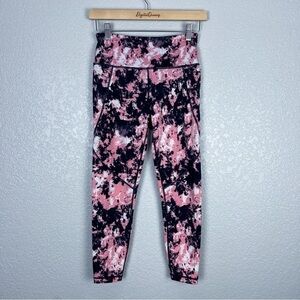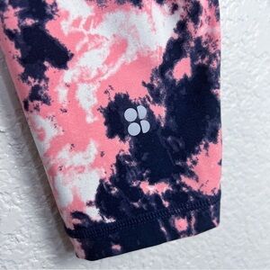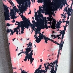 These Sweaty Betty Power 7/8 leggings in pink and navy feature a bold tie-dye print, high-rise fit, and supportive stretch fabric. Designed with a back zippered pocket, side pocket, and adjustable inner drawcord for functionality during workouts. Size XS (0-2). 62% polyamide, 38% elastane.