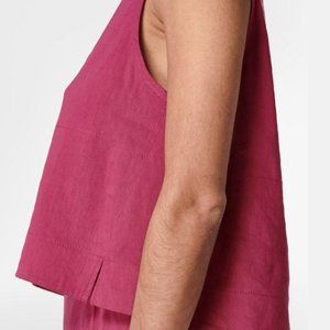 An elevated cropped linen tank top. Made from a lightweight stretch linen. Slightly cropped, relaxed fit with V-neck detail. Sleeveless silhouette with a dipped hem at the back. Falls to just above the hip.