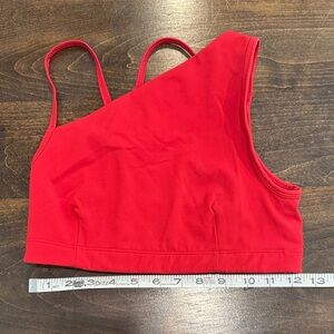 Stylish red sports bra with an asymmetrical design. Ideal for workouts or casual wear. Comfortable and supportive fit.