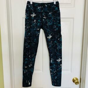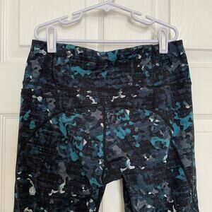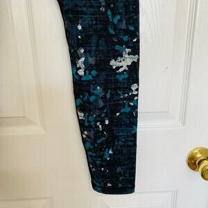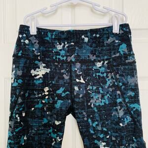 Blue, teal, white and gray splatter pattern in a soft, quality material. Interior adjustable waistband. Back zipper pocket. While there is some fading on the interior level, the exterior is in very good used condition.