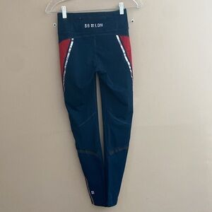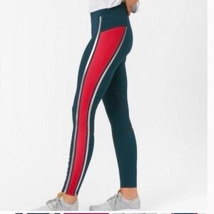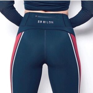 Sweaty Betty Zero Gravity leggings with contrasting blue/red panels and a side reflective strip