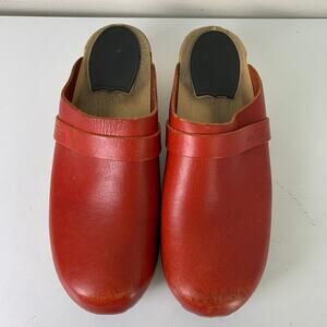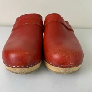 The electrifying Swedish Husband slip in is a handmade clog with a wooden sole and covering natural Italian leather, decorated with a thin leather strap. The retro squared toe and red color provides a new take on the classical clog style.