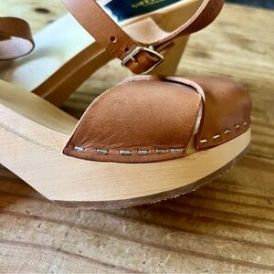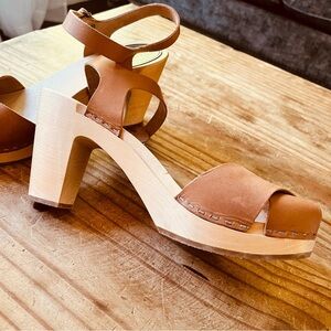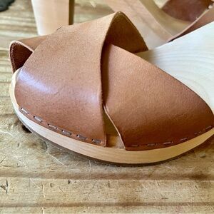 Swedish Hasbeens Merci Clog Sandals Leather Brown Tan Wood Heel Size 11. Worn 1x. Like brand new. Excellent condition.