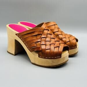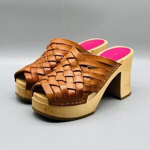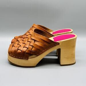 Swedish Hasbeens Shoes Womens 7 Brown Leather Woven Monika Wooden Heel Clogs