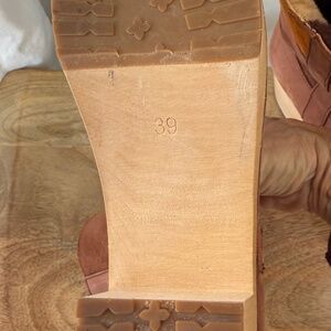 LIKE NEW, worn once! Pull on clogs. Patchwork suede exterior. Inside lined with fluffy Shearling and can be rolled down to show the shearling. Rubber sole, wood heel. 1"H wood platform, 2"H heel. Heel to top of boot is 10.5". Size EU 39. I wear a US size 8 and it fits fine.
