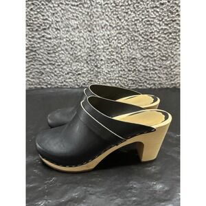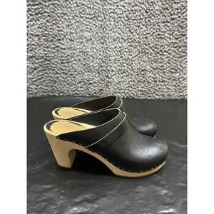 Swedish Hasbeens Toffel Black Leather Wood Clogs Heels Size 37