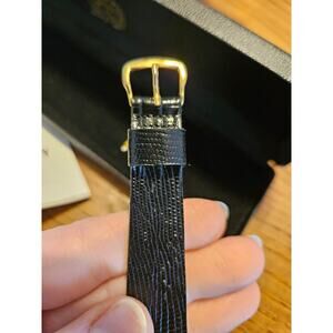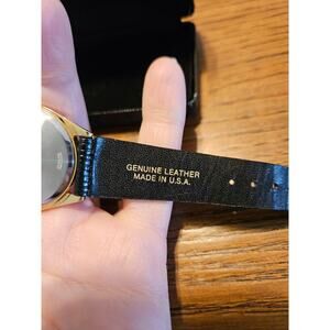 Watch is in excellent condition. Bought and never worn. Will need new battery. Strap genuine leather.
