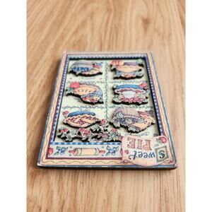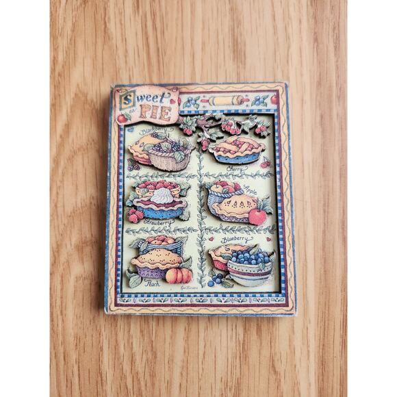 Charming “Sweet As Pie” 3-D layered magnet by R.A. Lang Card Co. of Canada, featuring six delicious pie designs — blackberry, cherry, apple, strawberry, peach, and blueberry — framed in a colorful cottage-style border.