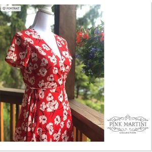 The wrap dress, Sweet Attitude comes in red with floral print. It has a modest v-neckline and short sleeves. It highlights your waist in a delicate '40s fashion. Wear yours with statement earrings.