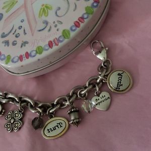 Sweet Brighton POWER OF PINK Pink Crystal Silver Plated Charm Bracelet 2006 in Good Pre-Adored Condition. Please See All Photos to See Charms, Including a Heart Locket Charm with a Magnetic Closure. Measures 7"-8 1/2" Adjustable with Extender Chain. Signature Brighton B Puffed Heart. Lobster Claw Closure. Included is the Brighton Breast Cancer Tin Shown In Photos. Please See ALL Photos for Design and Condition. Happy Poshing!