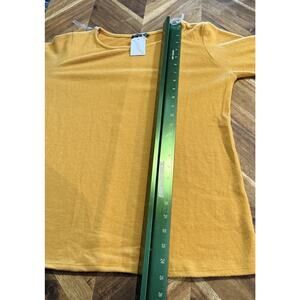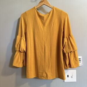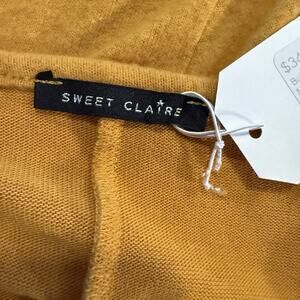 This Sweet Claire sweater is a stylish pullover designed for women in a size Medium. It features a unique bubble ruffle accent on the sleeves, adding a touch of femininity to the overall look. The sweater comes in a bright Yellow color, making it a cheerful addition to any wardrobe. With its raglan sleeves and knit fabric, this sweater offers both comfort and style. Perfect for casual wear, this Sweet Claire top is a versatile piece that can be easily paired with different bottoms for various occasions.