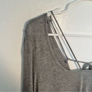 Good condition, minor wear. Sweet Claire. Long sleeve top. Ribbed. Scoop neck with adjustable tie details. Light heather gray. Style 1206XL4. Size large. Stretch 95% viscose, 5% spandex. Pit to pit laying flat 18" Shoulder to hem 30” Sleeve (pit to hem) 21". All measurements are approximate and taken lying flat. Smoke free home. No trades, offers welcome.