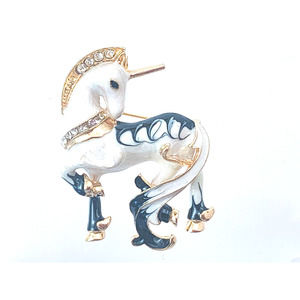 Imagine pinning on this little unicorn. Suddenly you have added a spark of magical romance that can be shared with all you encounter! The white enamel has a creamy swirl and his back, legs, and the tip of his tail add touches of ebony black. His hooves and horn are shiny gold tone. His mane and collar are gold-tone studded with tiny clear rhinestones for a bit of extra sparkle.