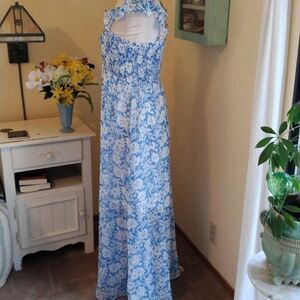 This lovely maxi has a semi-sheer overlay in a blue and white floral. The bodice is elastic shirring all the way around with a sweetheart front, lined there, and a sheer back. Ruffles on straps. Lined to knees. Size XL measures 36-50 at chest, 44 at waist (lining), 54 at hips (lining) 59 long from shoulder to hem. Crisp and cool looking for warmer weather events, weddings parties, walks on the beach. Like NEW.