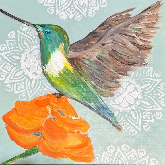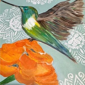 Colorful canvas art featuring a lively hummingbird and bright orange flower. Ideal for nature lovers. Acrylic on flat panel canvas which is ideal for framing.