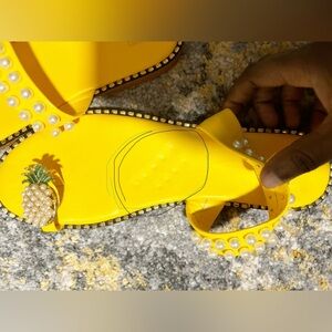 Ladies' Sweet & Fresh Toe-Post Sandals With Pearl & Pineapple Decor, Yellow Flat Sandals