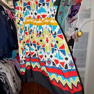 Discover this stunning Sweet Ginger midi dress in size Large, featuring a vibrant geometric print in cobalt, coral, and yellow with a flattering cinched waist. Crafted from lightweight fabric, it’s perfect for a chic yet relaxed look. This piece has been gently worn, laundered with sensitive detergent and infused with scent beads for a fresh arrival. It will ship the next available business day via standard shipping, and I’m happy to consider any reasonable offers. From a smoke-free home—bundle for extra savings!