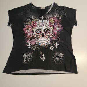 Sweet Gisele Sugar Skull T-Shirt Rhinestone Embellished Double Sided Womens XXL