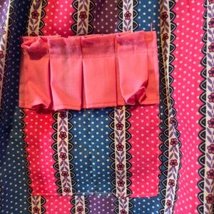 The apron features a vibrant combination of patterns, including bold stripes in pink, purple, and blue, accented by a playful polka dot waistband. A handy pocket on one side provides a convenient spot to keep your utensils, recipe cards, or crafting tools close at hand. The pocket even has sweet little ruffled accents!