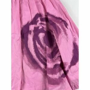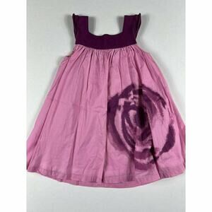 Pink with rose on front. Rose has a spray painted look. Lined. Overall dress is very good condition but the top portion has pilling. Would be a good one for Valentine's Day!