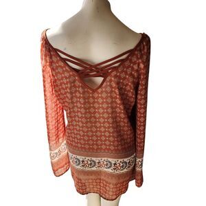 Sweet Journey Mixed Floral Bell Sleeve Semi Sheer Blouse Boho Women Sz L Peasant
