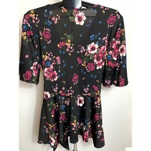 Features a beautiful black floral pattern with a flattering V-neck and short sleeves.