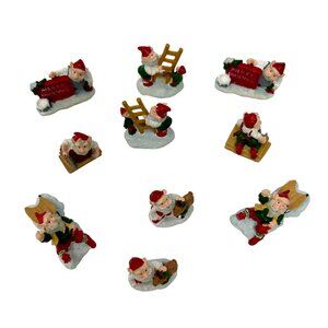 Bring festive charm to your Christmas village with a set of 10 adorable North Pole elves, featuring 2 of each design. Perfectly crafted in painted resin, these colorful elves range from 1 to 2 inches in size. Elves on Sleds, Elves holding a Merry Christmas Sign, Elves with a reindeer, Elves sawing a piece of wood, and Elves holding a ladder.