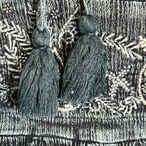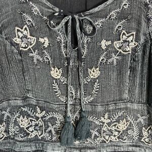 Sweet Magnolia Embellished Boho Prairie Beaded Green Black Maxi Dress L. Empire waist. Adjustable on sides with tassels. Good pre-owned condition.