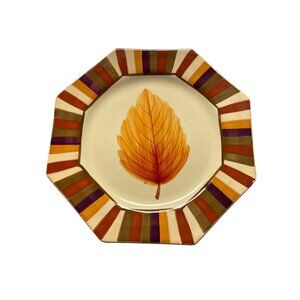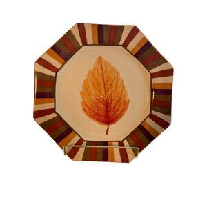 Add seasonal charm with this vibrant octagonal ceramic plate, designed by Lisa Levy for Sweet Olive Designs. Measures approximately 10.5″ across, with a bold multicolor striped border and a striking painted autumn leaf motif, perfect for Thanksgiving or cozy fall table settings. It's microwave- and dishwasher-safe, combining function with festive flair. A delightful piece for collectors or seasonal décor.