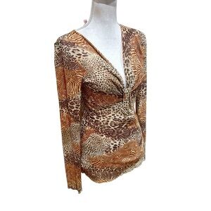 Sweet Pea tonal tan brown animal Print v neck sheer netting blouse top sz large