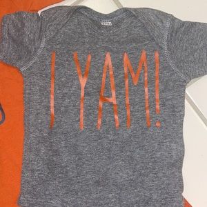 Adult M Unisex orange t shirt that says “She’s my sweet potato” and gray baby 12 month onesie that says “I Yam”