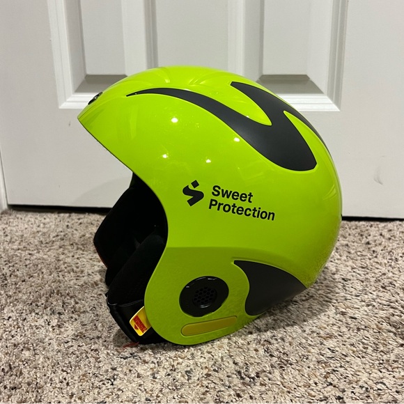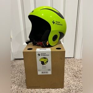 Sweet Protection Volata MIPS racing helmet; FIS rated. In great condition aside from a few scuffs from goggles/snaps. Comes in original box with dust bag. Size S/M