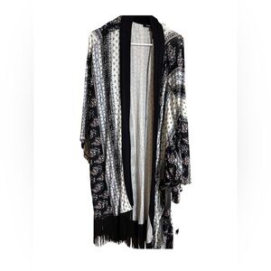 This elegant cape from Sweet Rain features a bold black and white design, perfect for making a statement. Its flowing silhouette and open-front style offer a versatile layering option for any outfit. Crafted from a soft, drapey fabric, it provides both comfort and style.