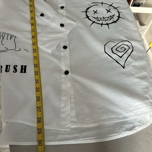 Make a bold statement with this Sweet Rain Young Contemporary oversized button-down shirt. Designed with expressive black graphic art and lettering, this top features phrases like “untamed,” “crush,” and “strange,” paired with edgy line art illustrations on both the front and back.