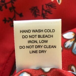 Solid red-orange fabric with floral bouquet print throughout. Pullover style with cap sleeves, pleated scoop neck, round bottom hem, and keyhole button closure in back. Top is in excellent, like new condition with no flaws. Purchased new, never worn.
