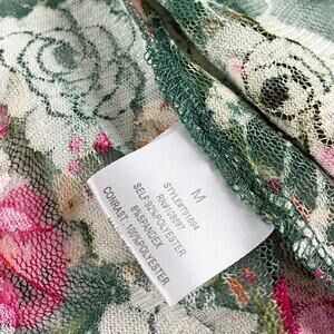 Sweet Rain safe green floral lace mesh versatile open cardigan duster coverup with fringe in good condition. 92% Polyester 8% spandex. Dark sage backdrop with fuchsia pink and coral hue bouquets. Tagged Medium. Approximate measurements laying flat are: Underarms 26.5” | Sleeve from collar 16” | Length from to op shoulder to fringe 26.5” | Fringe 6”
