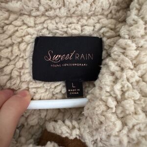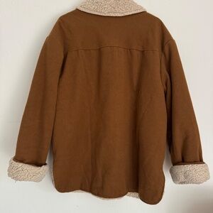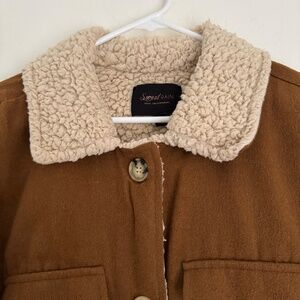Stay cozy and stylish with this Sweet Rain sherpa-lined barn jacket. Featuring a soft, fluffy camel exterior with cream sherpa lining and tortoise shell buttons, it has an oversized, relaxed fit—perfect for layering over fall and winter outfits. The cute collar, decorative sleeves, and classic barn-jacket styling make it a casual, comfy staple. Well-loved but in good condition, the fabric has softened beautifully with wear, adding to its cozy charm. Ideal for chilly days when you want both warmth and style.