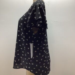 Elegant black blouse with white butterfly pattern. Features short ruffled sleeves. Ideal for both work and casual wear.