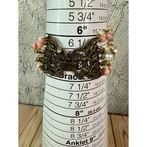 The Sweet Romance USA Faux Mabe Victorian Revival 9-Strand Bracelet & Ring Set is a stunning jewelry set featuring a multicolor design with rhinestone and faux pearl accents. The set includes a bracelet and ring, both signed by the brand Sweet Romance. The intricate Victorian revival design is highlighted by the main stone, faux Mabe, which adds a touch of elegance to the piece. The adjustable features make it versatile for different occasions, making it a romantic and fashionable accessory set for any jewelry lover.