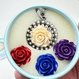 This Sweet Romance necklace for women features a silver tone interchangeable pendant with exquisite red flowers. Made from silver tone metal, glass, and lucite, it measures 26 - 28 inches.