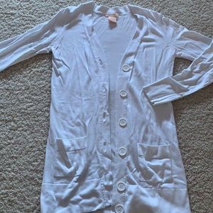 GUC lightweight long sleeve button up long cardigan, some light stretch, size Large. Some light wear on garment, very mild pilling, some very light staining underarm that is not very noticeable unless looking, may be removed by stain treatment. Cardigan is soft and comfortable.