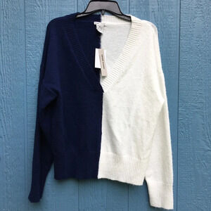 Sweet Romeo brand V Neck Colorblocked Stripe Sweater Pullover Blouse, size medium M. Brand new with tags NWT. Navy blue and white. Has a fuzzy prepilled texture. Smoke free, pet free home. Ships same or next day