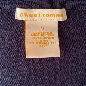 This is a sweet Romeo navy blue V-neck sweater in a size small. It is 100% acrylic. Worn to be oversized.