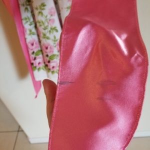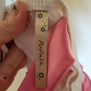 Super girly white cotton dress! Featuring a delicate pink flower design and coordinating pink satin-y trim. Sewn-in triple pleated waistband leads to a wide tieback sash (there is a small discoloration on the bottom of the sash part where it got washed with an ink pen-picture#4), but it's not hardly noticeable once the sash is on and tied in a bow :)