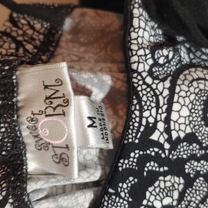 Sweet Storm Black White Print Spaghetti Strap Dress Stretchy Rosette Detail Size M See Photo For Small Tear Not Visible When Worn.